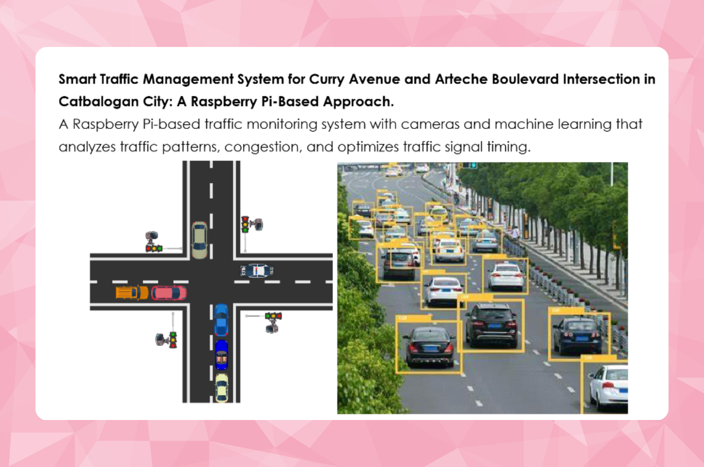 A Raspberry Pi-powered traffic monitoring system that uses cameras and machine learning to analyze traffic flow, detect congestion, and optimize signal timing for smarter intersections.